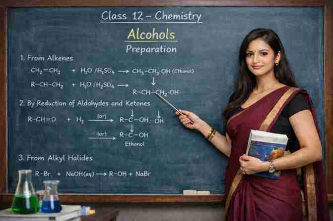 आज हम कक्षा 12 रसायन विज्ञान (UP Board) के अत्यंत महत्वपूर्ण टॉपिक Alcohols Preparation (ऐल्कोहॉल की निर्माण विधियाँ) को विस्तार से समझेंगे।