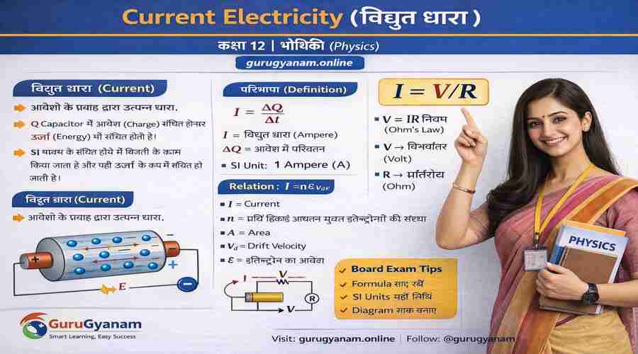 Current Electricity भौतिकी का वह अध्याय है जो हमें यह समझाता है कि विद्युत धारा कैसे बहती है, किन नियमों से नियंत्रित होती है और दैनिक जीवन में इसका उपयोग कैसे होता है। यह अध्याय UP Board Class 12 Physics में अत्यंत महत्वपूर्ण है क्योंकि इससे numericals + theory + derivations सीधे पूछे जाते हैं।