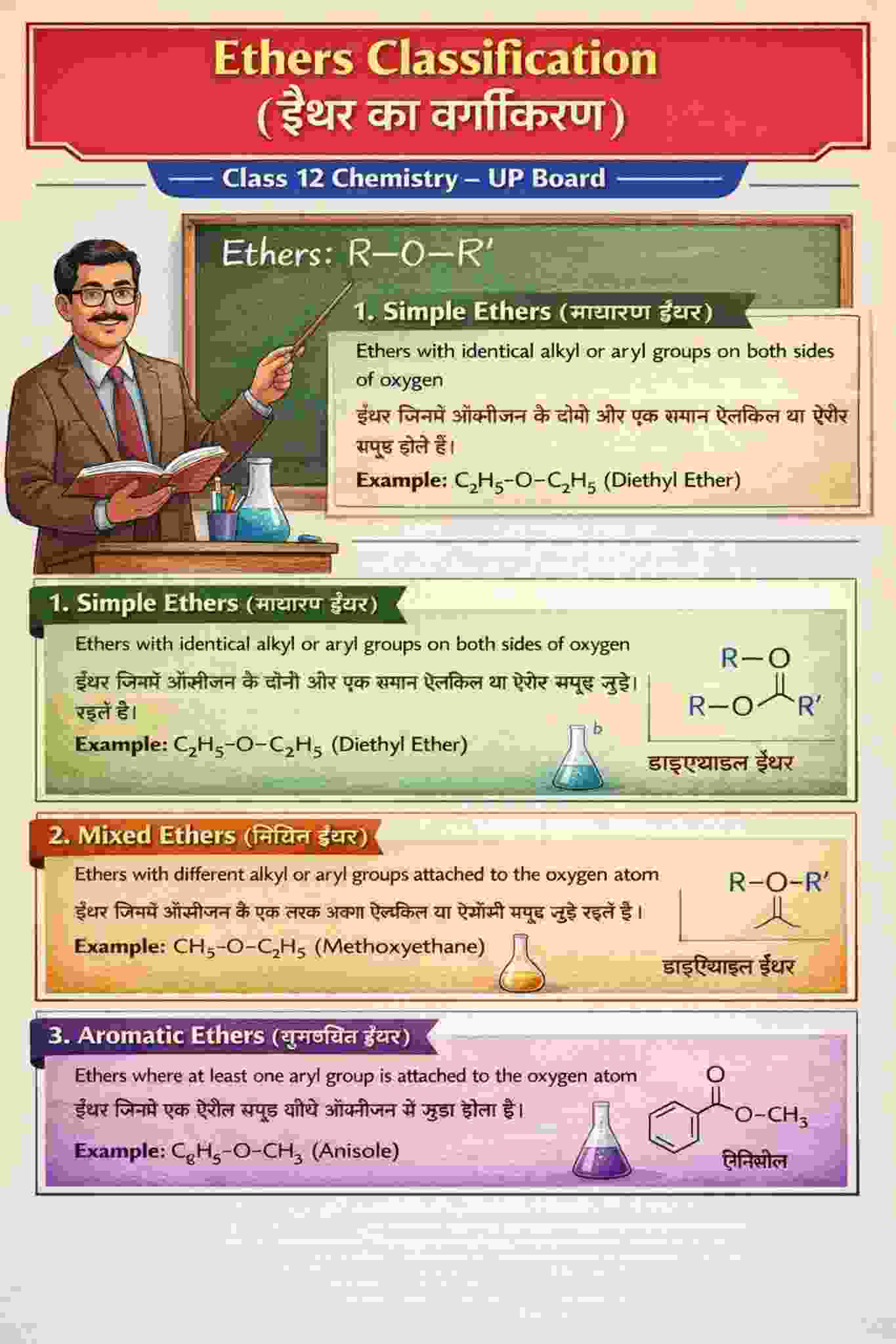Class 12 Chemistry (UP Board) में “Alcohols, Phenols and Ethers” अध्याय अत्यंत महत्वपूर्ण है। इस अध्याय में Ethers Classification (ईथर का वर्गीकरण) एक बुनियादी लेकिन परीक्षा-उपयोगी टॉपिक है।
