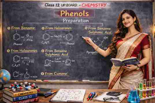 Class 12 Chemistry (UP Board) में Phenols Preparation एक अत्यंत महत्वपूर्ण टॉपिक है। बोर्ड परीक्षा में अक्सर फिनॉल की तैयारी की विधियाँ, अभिक्रियाएँ, समीकरण और औद्योगिक प्रक्रिया पूछी जाती हैं। इस लेख में हम Phenols Preparation को सरल, स्पष्ट और परीक्षा-उपयोगी तरीके से समझेंगे।